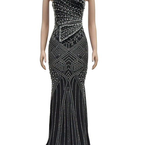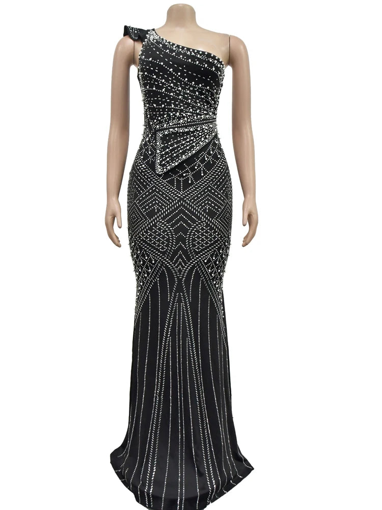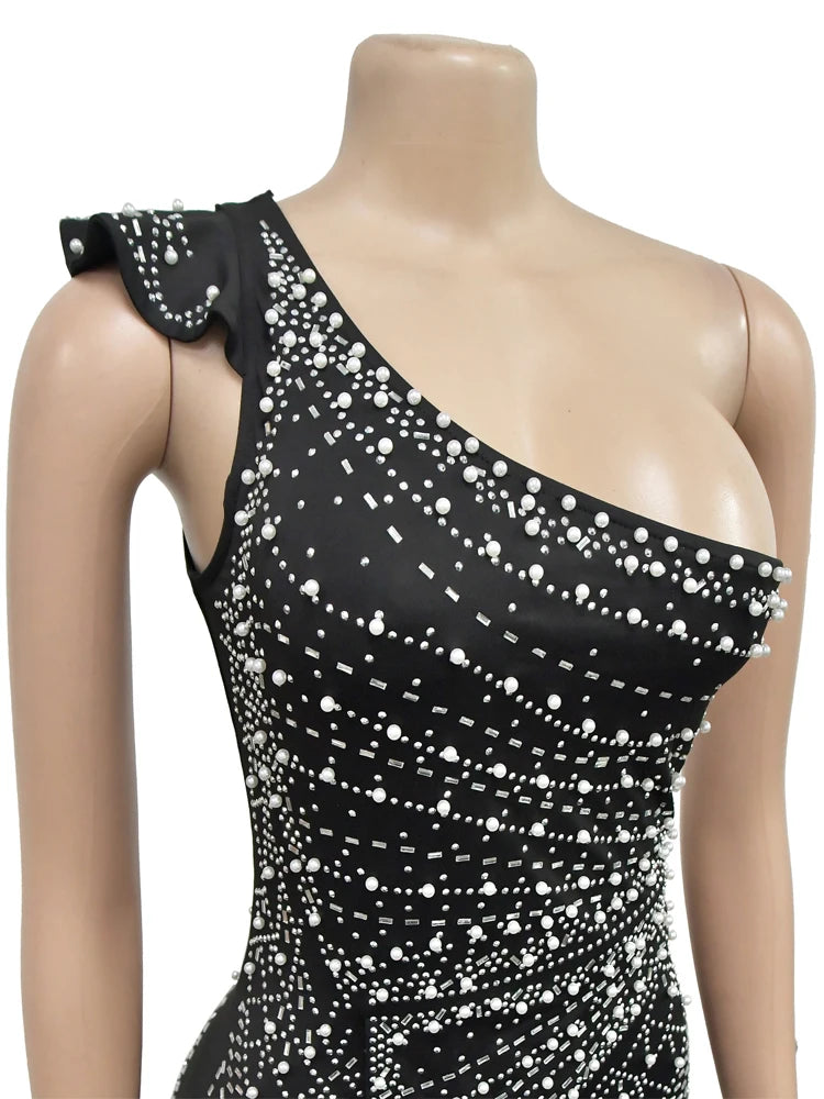 VESTIDO DE PEROLAS E STRASS,DE OMBRO UNICO.